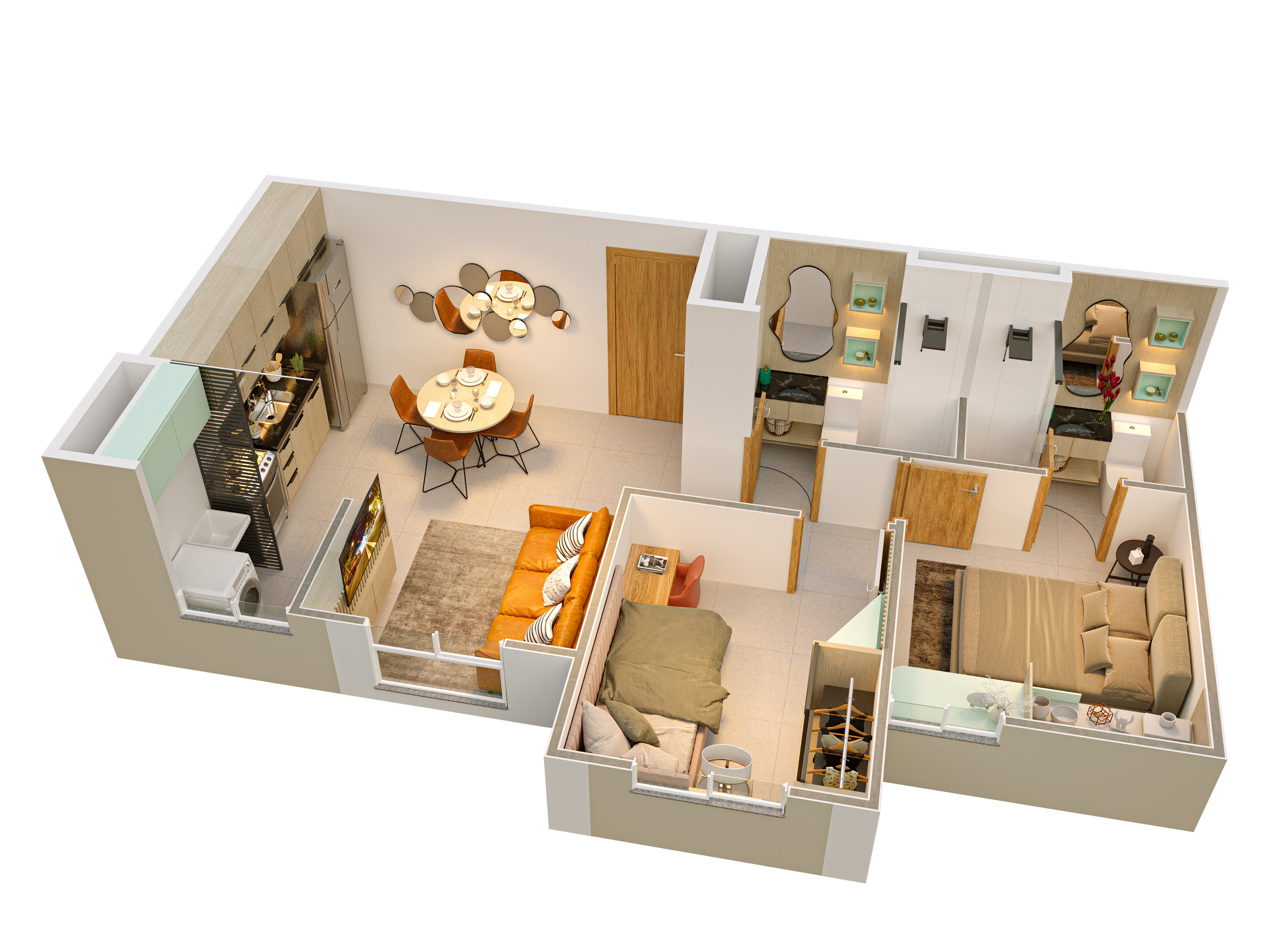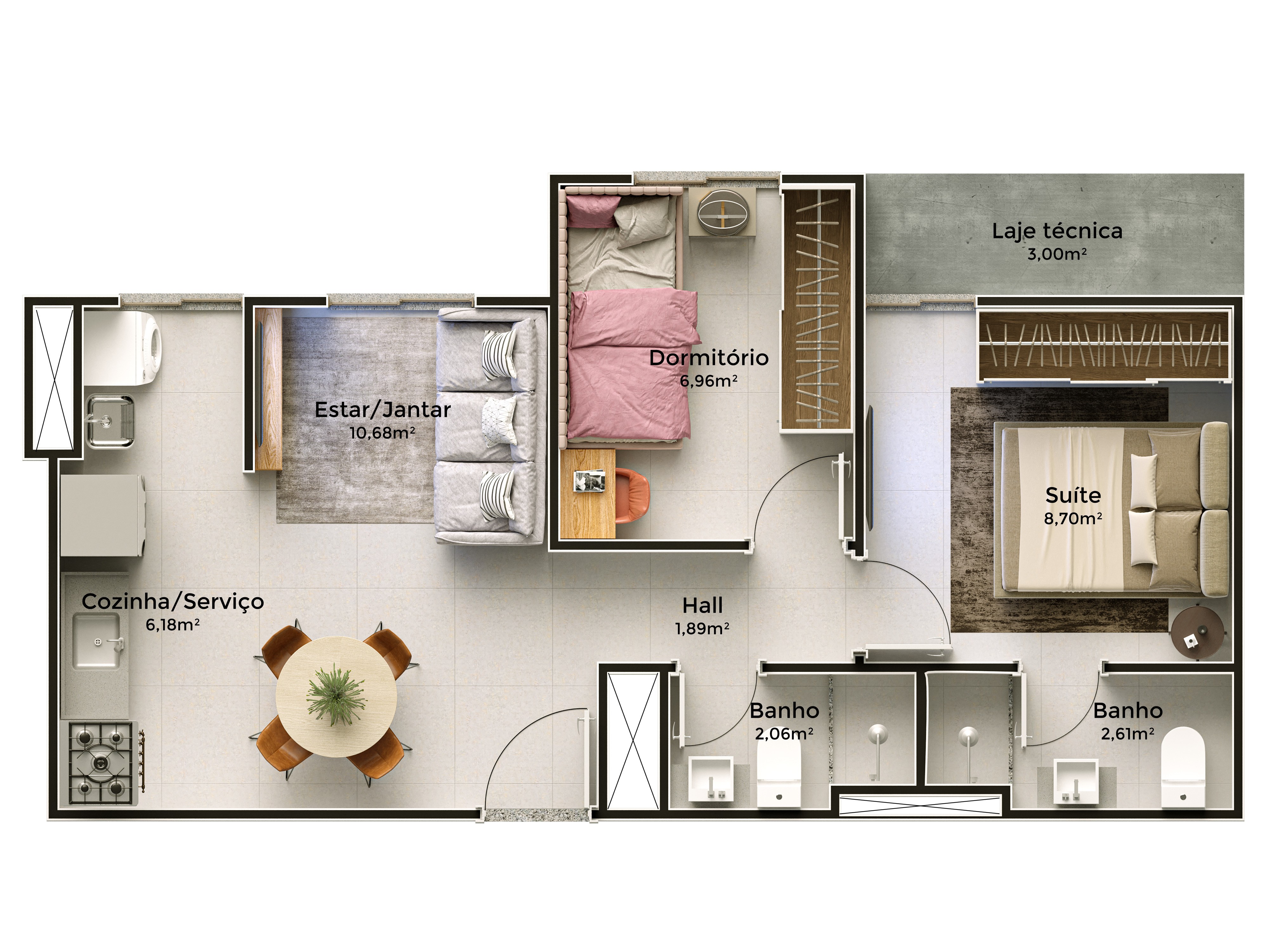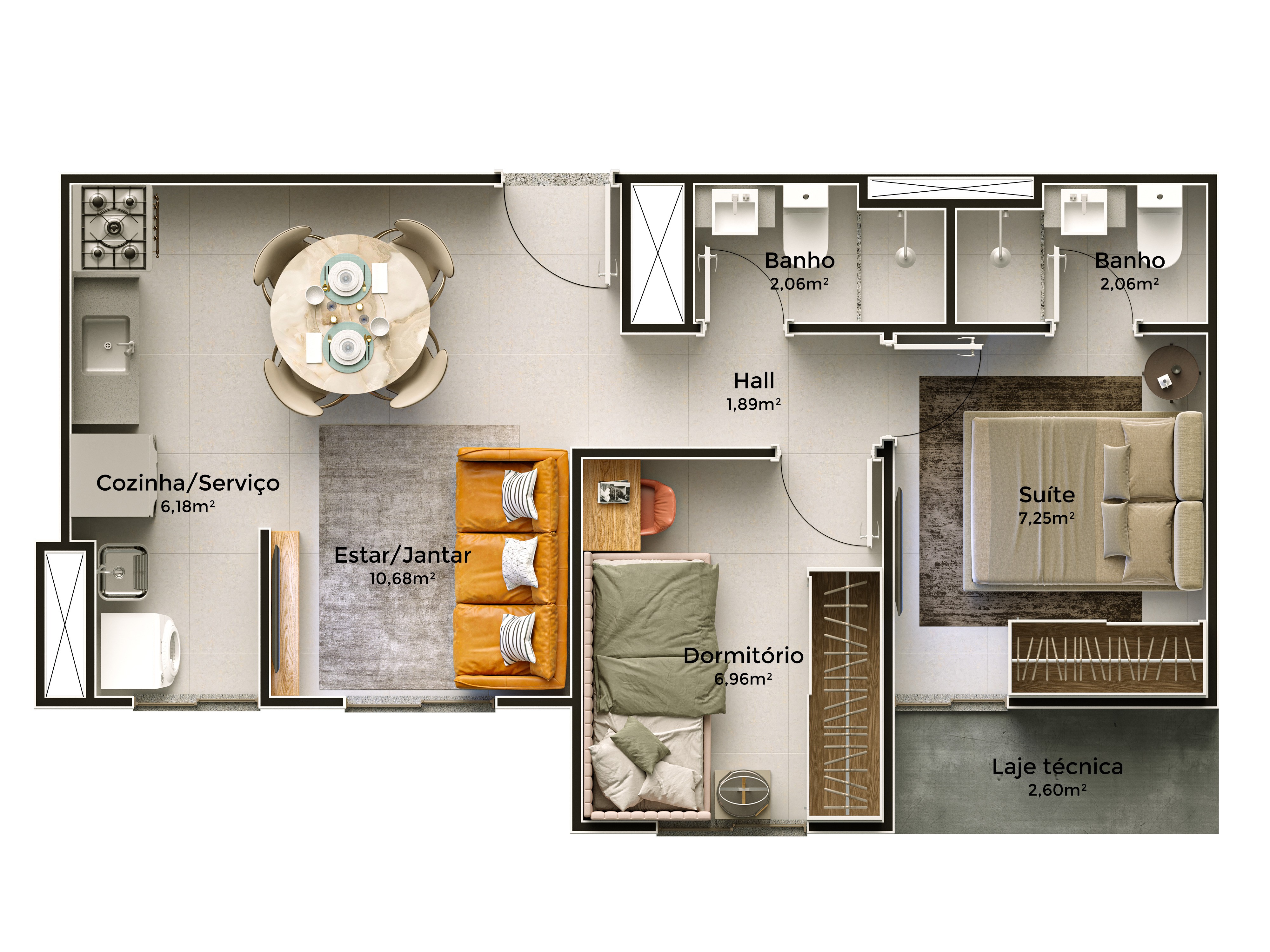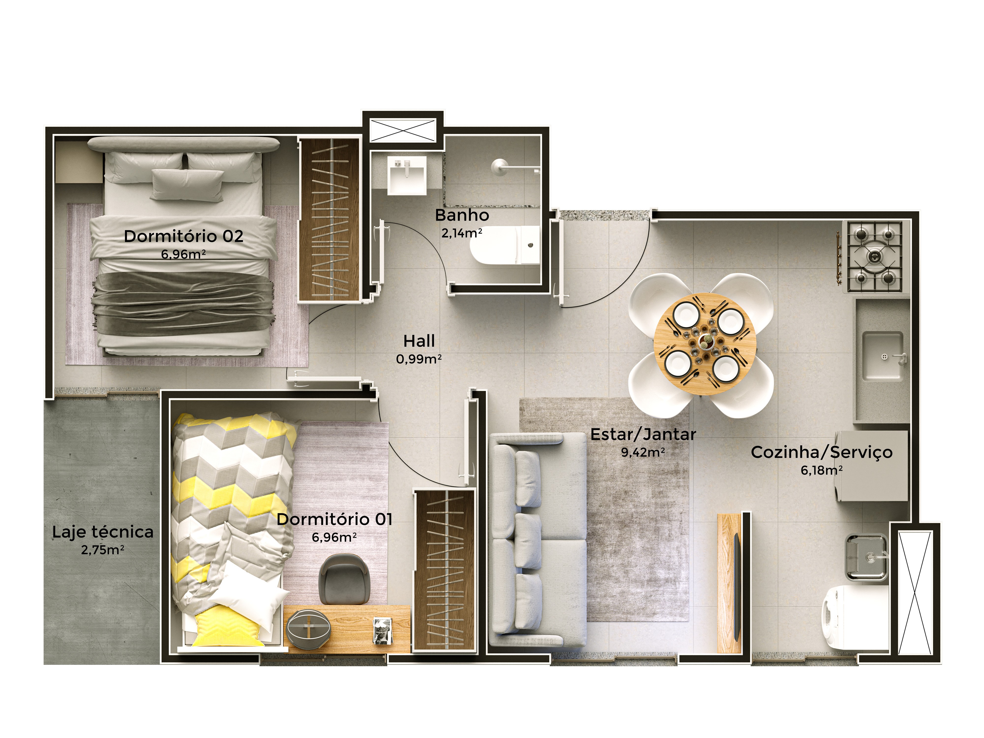 *Plantas ilustrativas com sugestões de decoração. Os móveis e equipamentos têm dimensões comerciais e não fazem parte do contrato. As medidas são internas e de face a face das paredes, sujeitas a pequenas variações de acordo com exigências técnicas e /ou acabamentos. O imóvel será entregue conforme o manual descritivo.